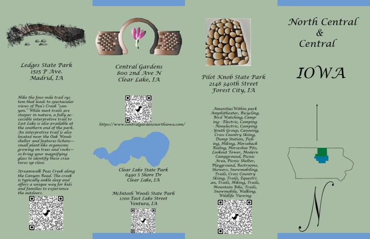 The Graphic Design II map project is a digitally illustrated map of my favorite North and Central Iowa State Parks. They include, Pilot Knob State Park near Forest City, IA, Central Gardens of North Iowa, Clear Lake State Park, McIntosh Woods State Park near Ventura, IA, and Ledges State Park near Boone, IA.